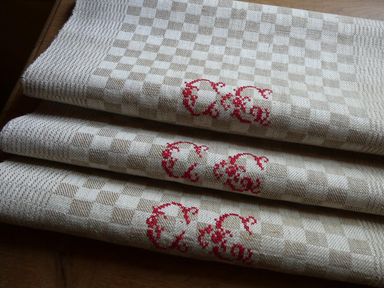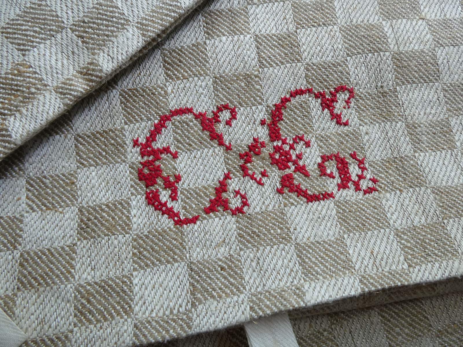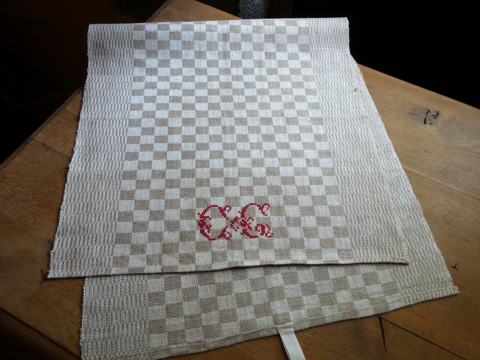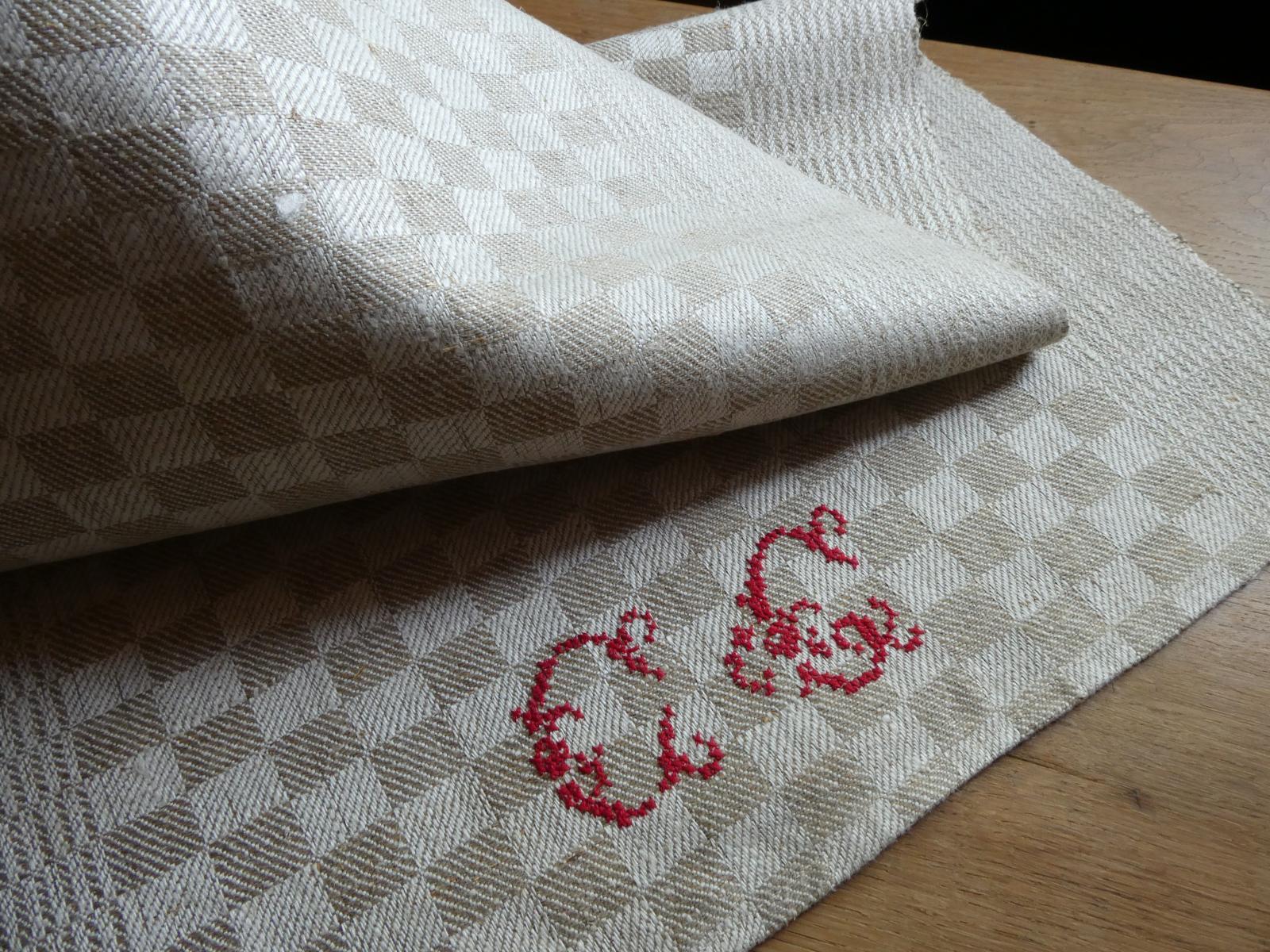 控えめな光沢のあるグレージュのダミエ柄、両端は波模様のような織柄の合わせ、裾には赤糸で大きなイニシャルが手刺繍されています。所々に混じる麻の繊維が素朴な手織りリネン、張りがある厚手ですがしなやかです。