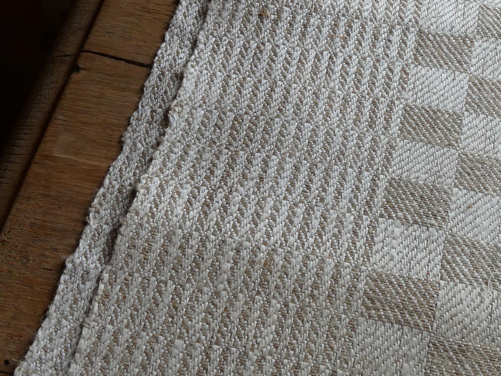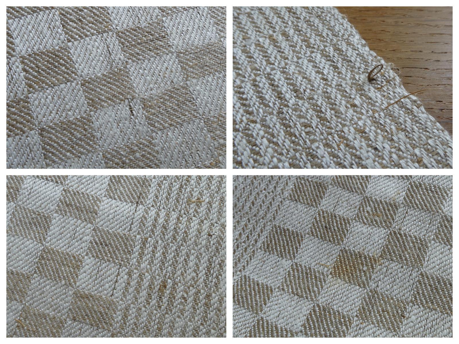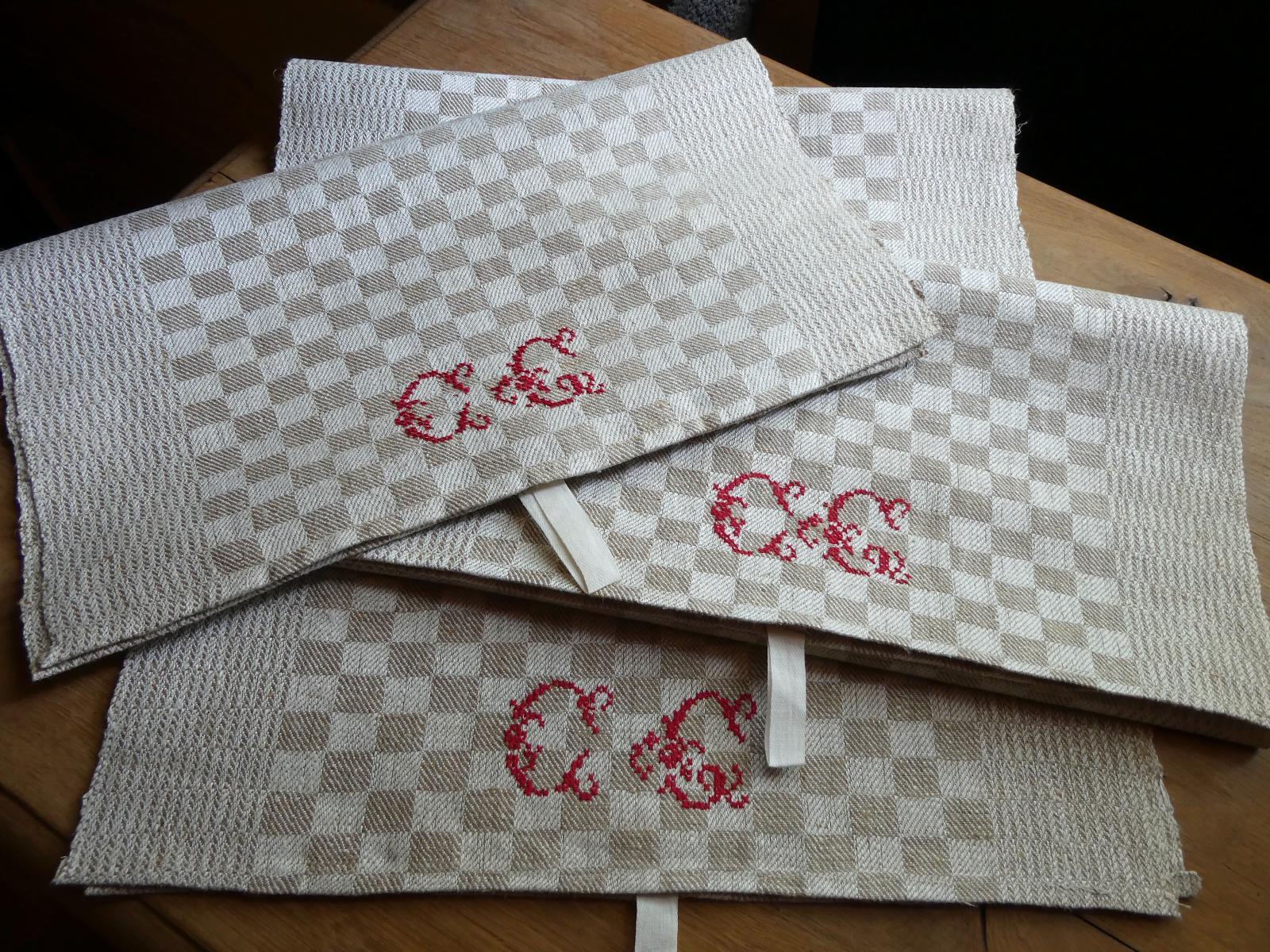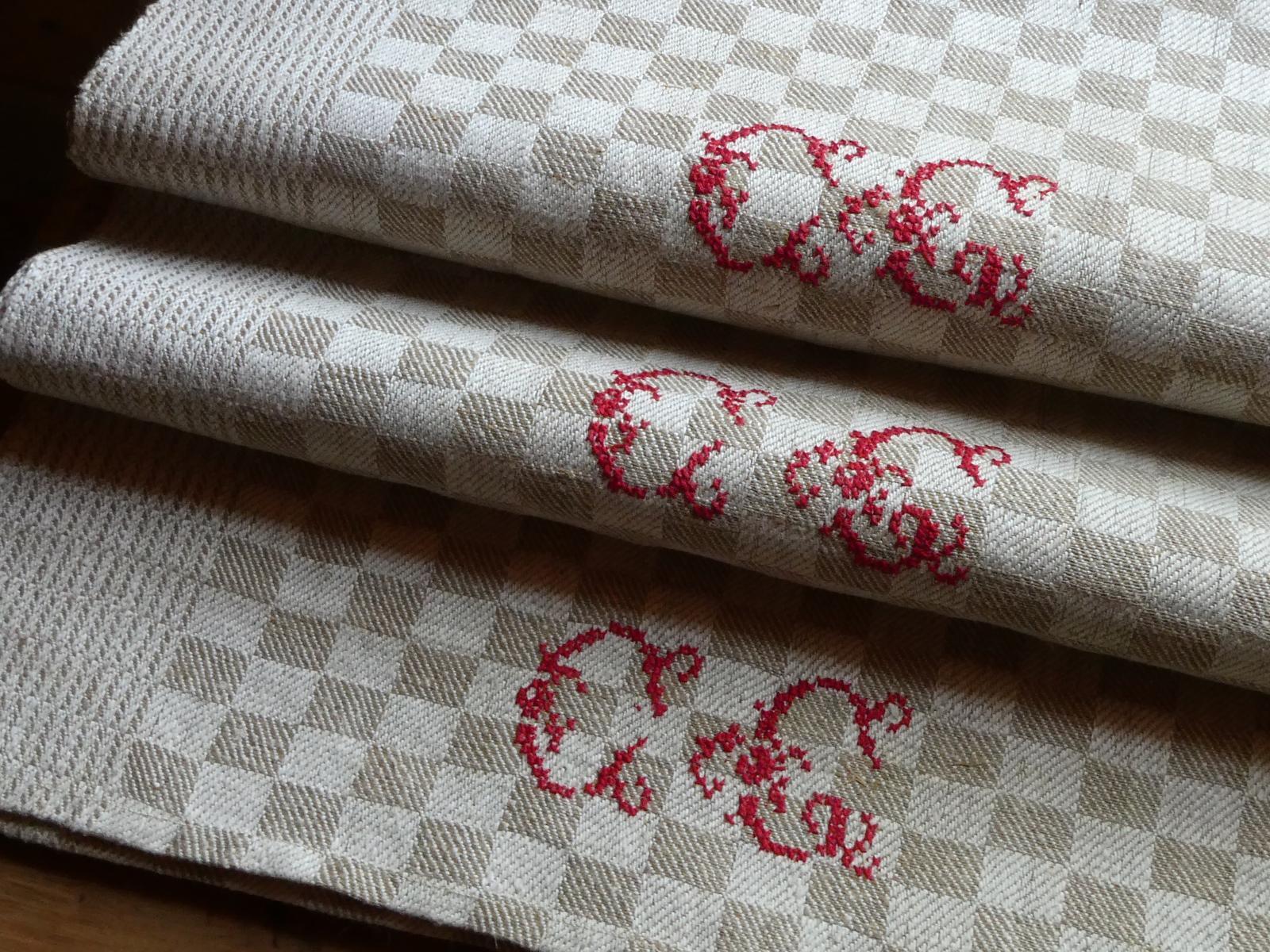 控えめな光沢のあるグレージュのダミエ柄、両端は波模様のような織柄の合わせ、裾には赤糸で大きなイニシャルが手刺繍されています。所々に混じる麻の繊維が素朴な手織りリネン、張りがある厚手ですがしなやかです。