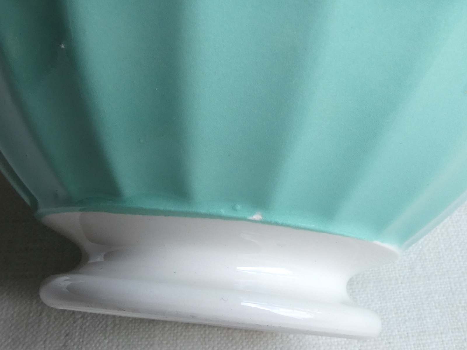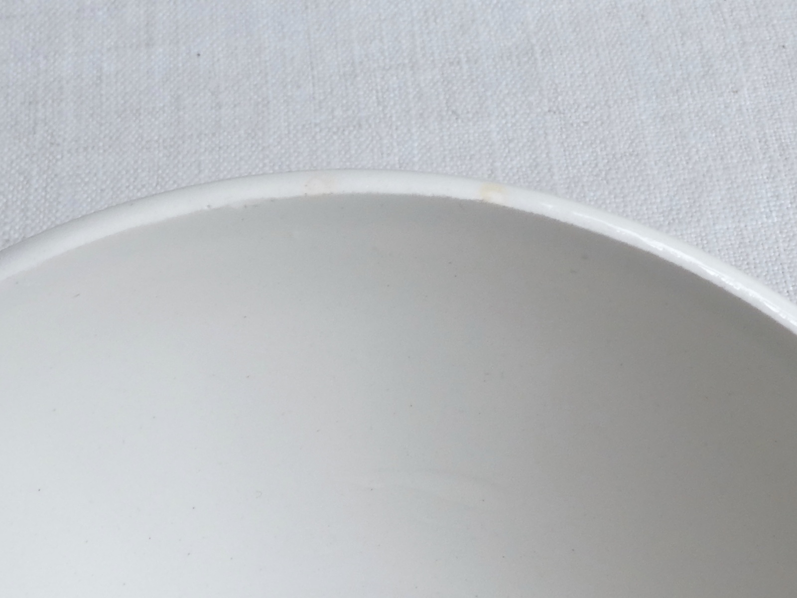 デッドストック、または同等です。内縁に釉付きある素地傷、高台上に緑釉抜け・黒点があります。艶やかできれい、大変良い状態です。