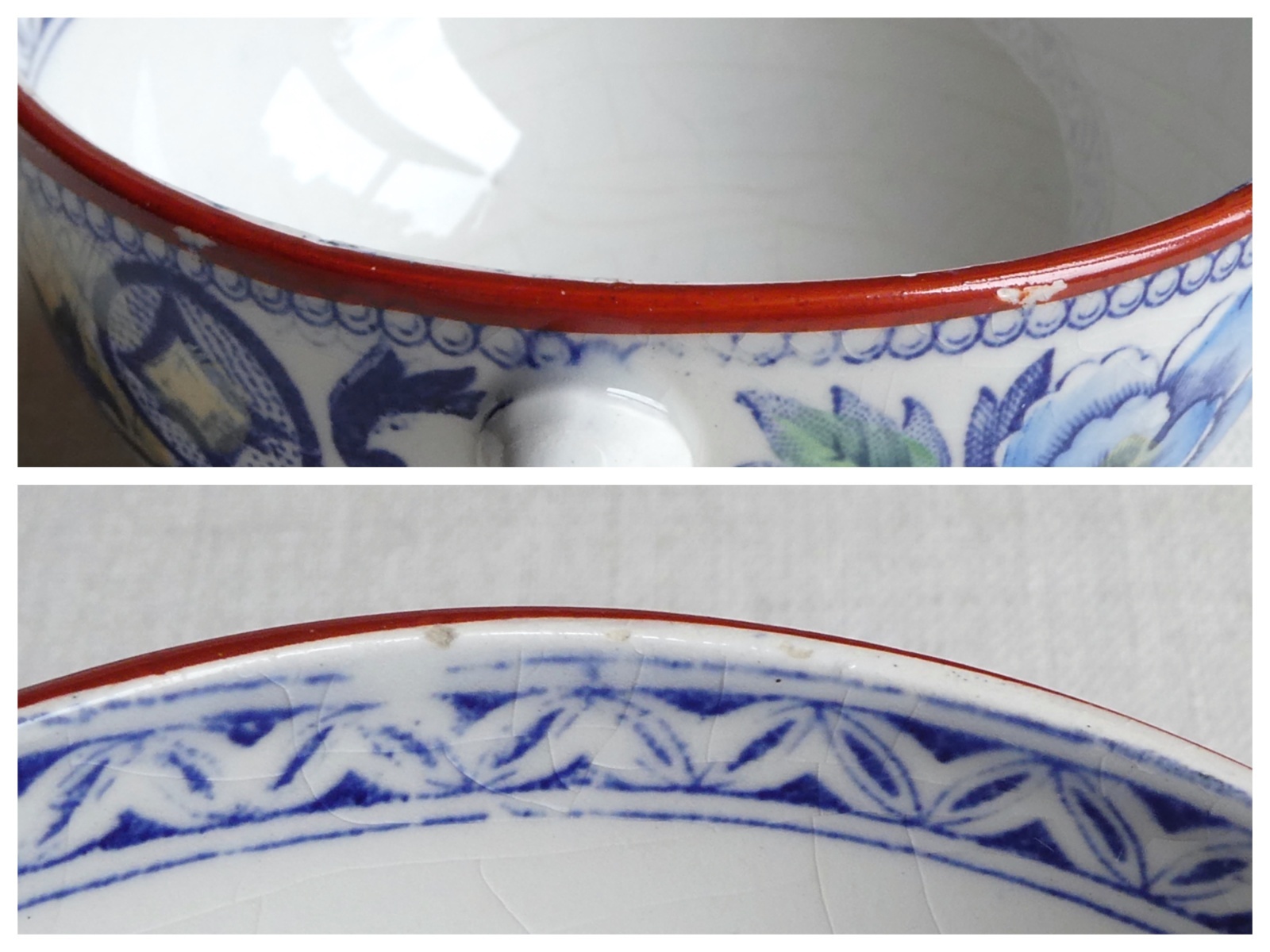 ひとつのカップの縁に軽い釉削げ、見込みに少々色入り、別のカップの内縁に欠け1箇所、内外に色入りがあります。経年を鑑みても艶やかで良い保存状態です。