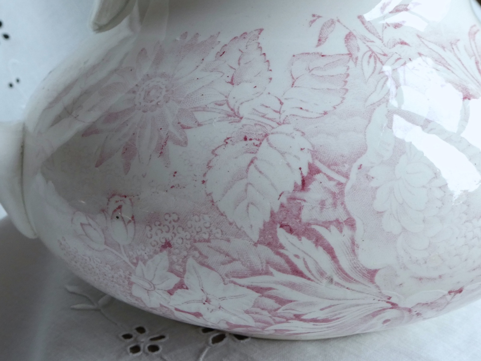 競い咲く花々が描かれたとても優美で華やかな印象の水差し、重心を下にコロンと丸みを帯びたフォルム、持ち手や大きく開いた上縁にも繊細な絵柄が施されどこから見ても美しい姿です。淡く霞むような薄いピンクがエレガントで優しい雰囲気です。