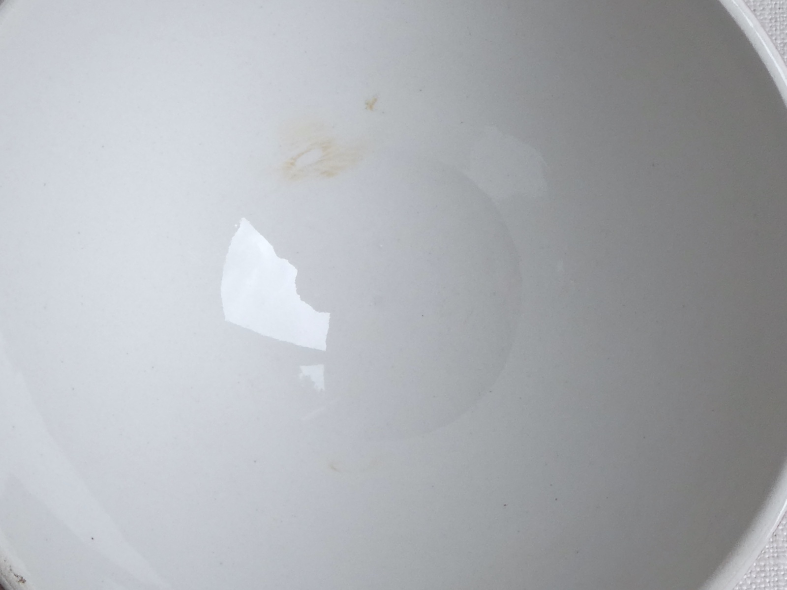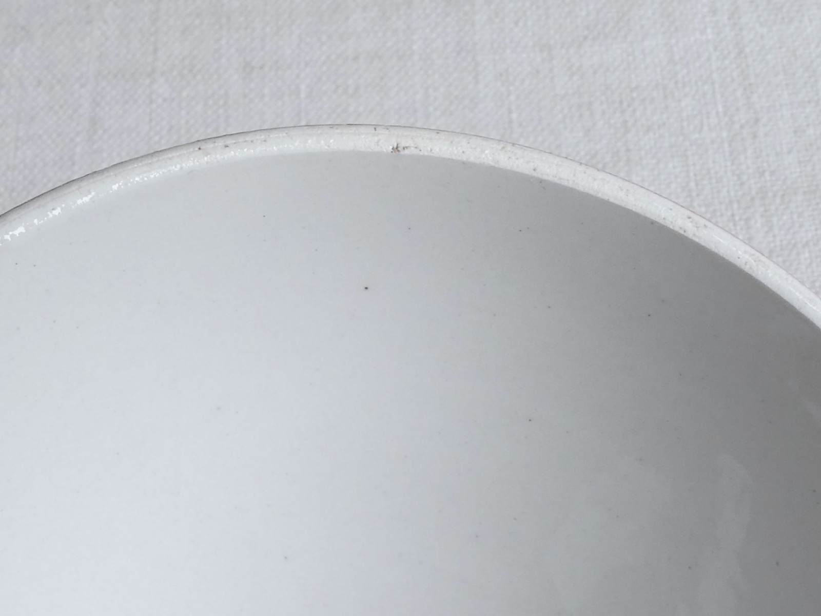 外縁に釉削げ、見込みに薄い色付き箇所があります。使用の形跡ほぼ無く、デッドストック品または同等です。艶やかできれい、とても良い状態です。
