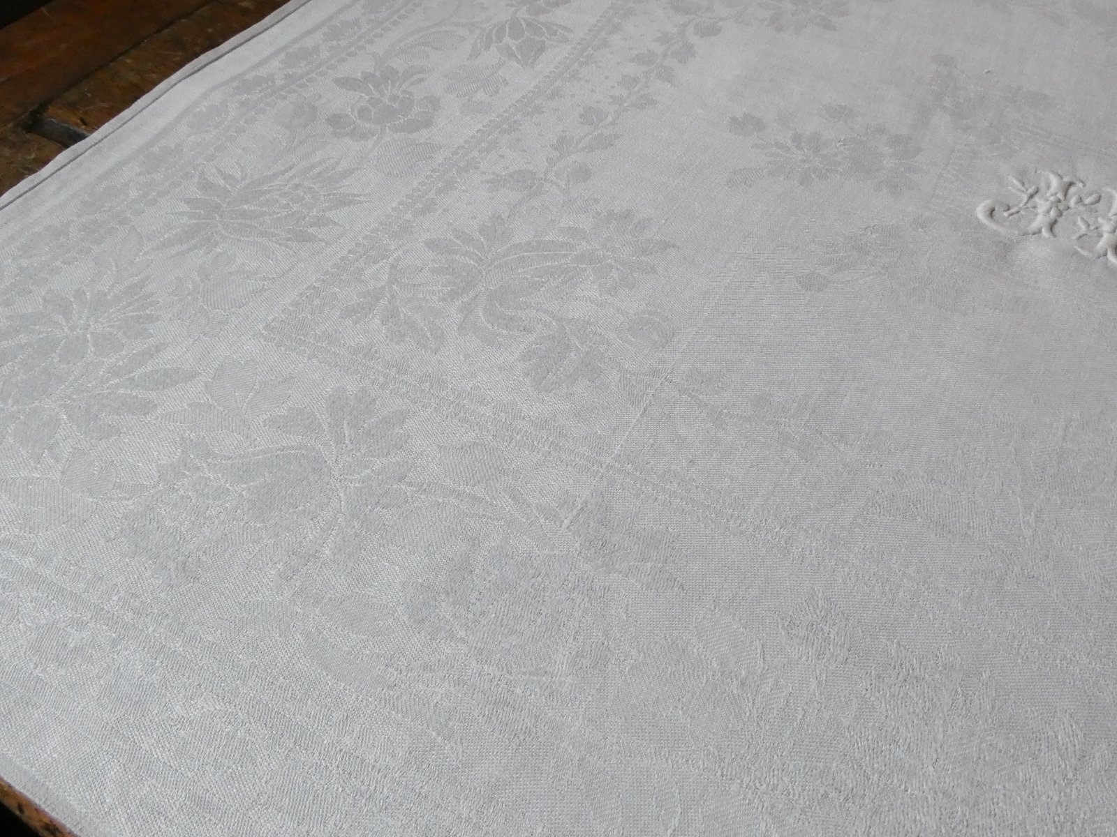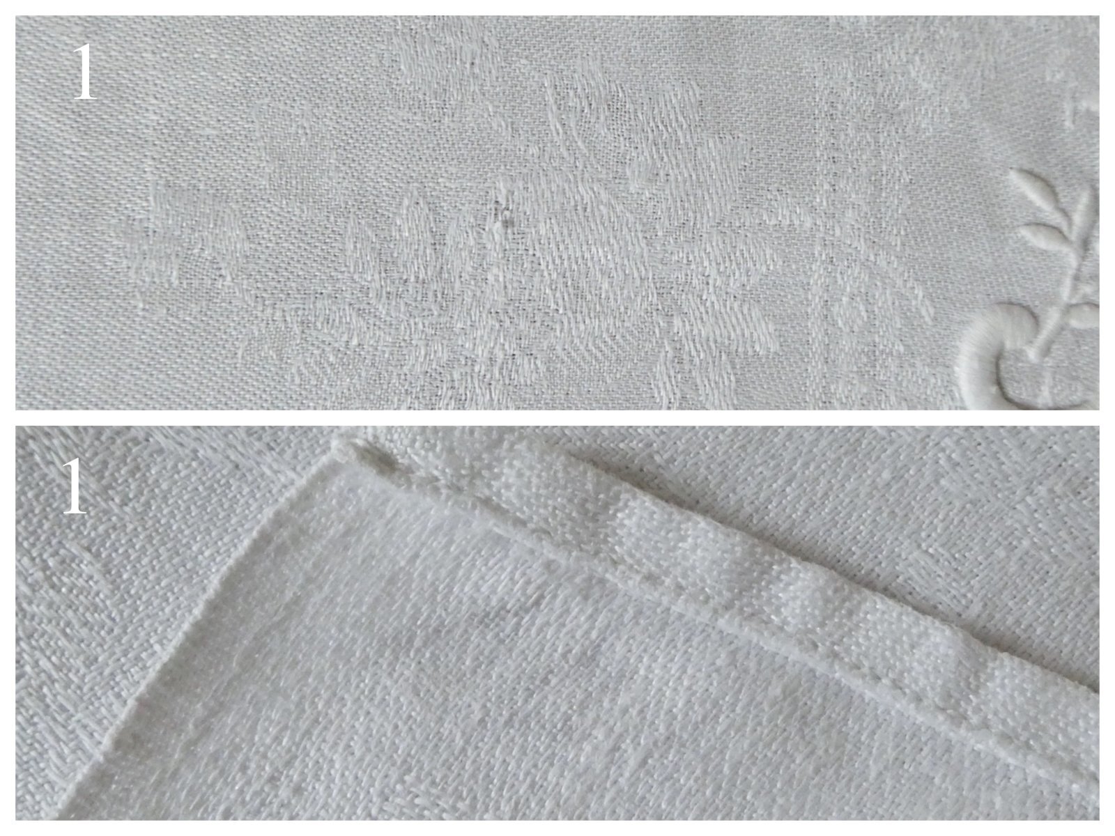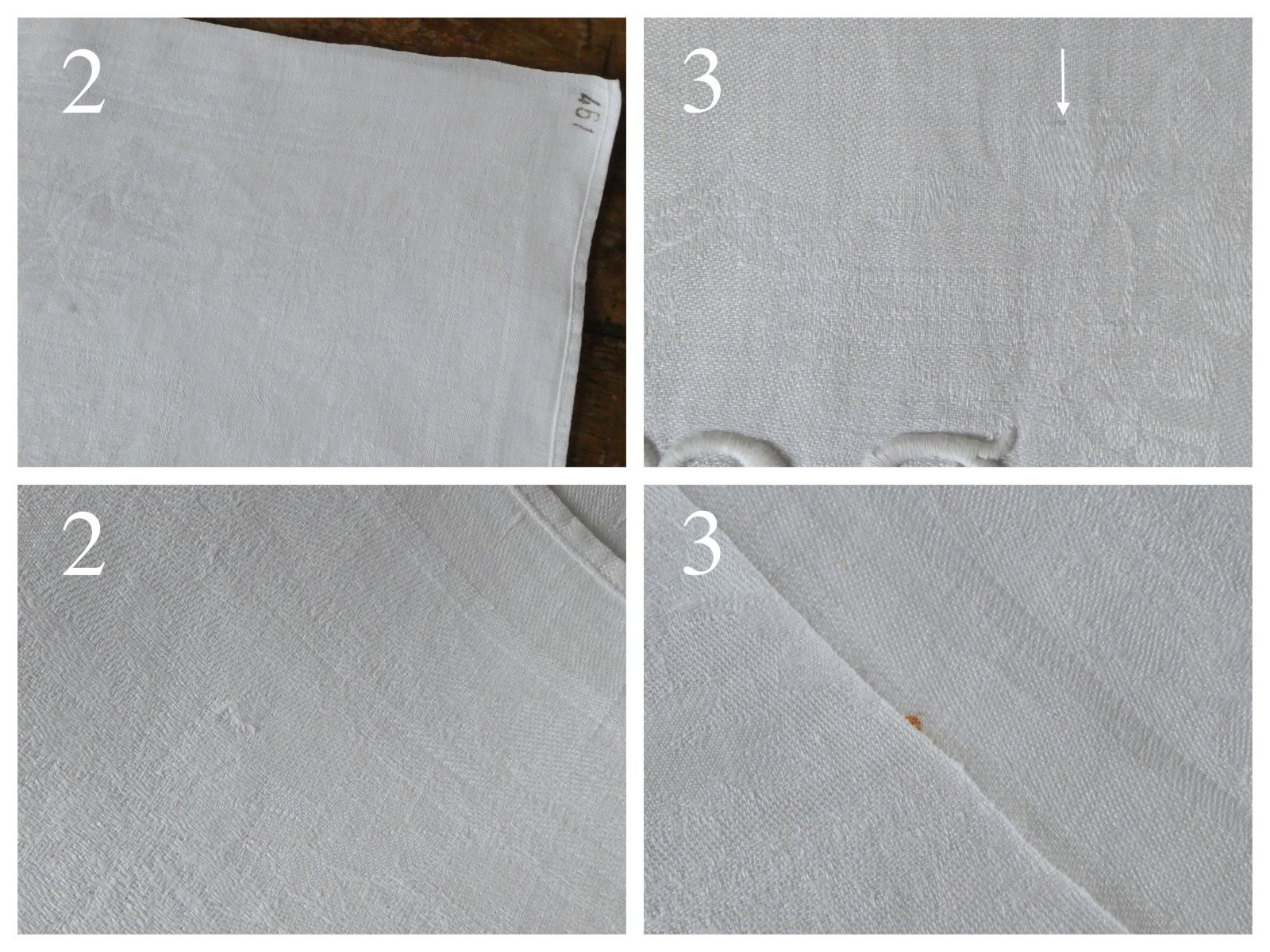 ダマスク織りにありがちな糸玉や軽微な糸の飛び出し、ネップがあります。実際探さないとわからないほどの軽微な解れ、小さな染み、2枚の隅に数字の印字(うち1枚は殆ど見えません)があります。その他全体として綺麗で良い状態です。