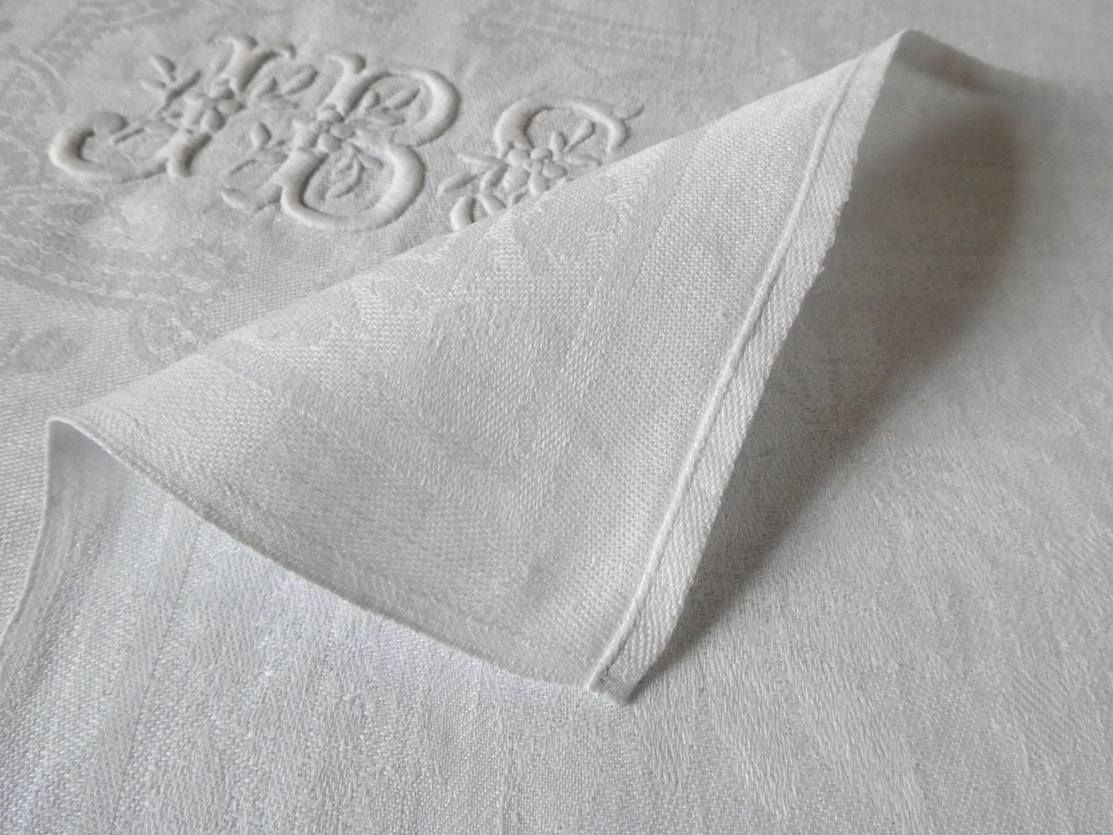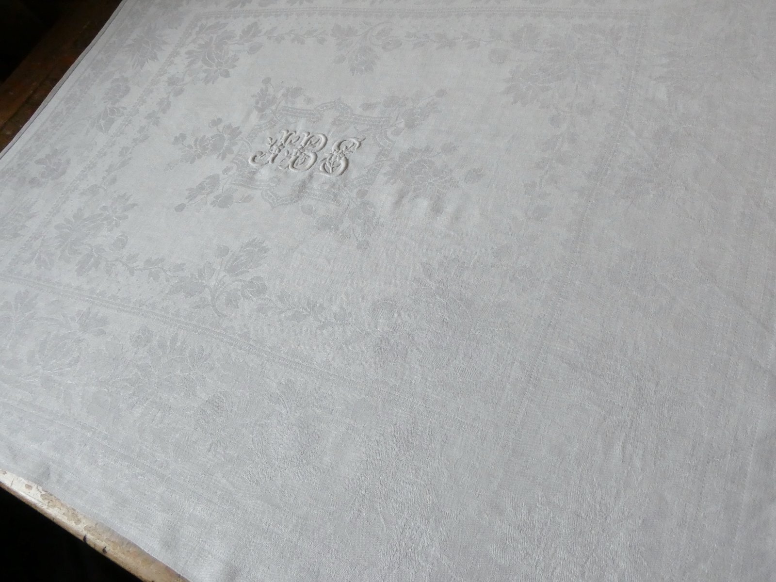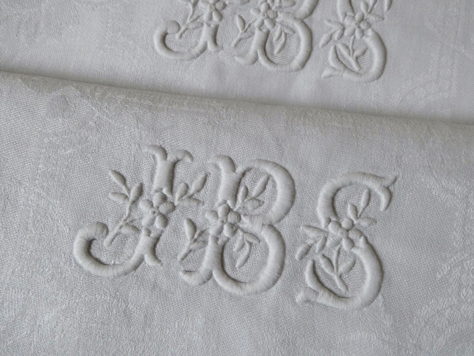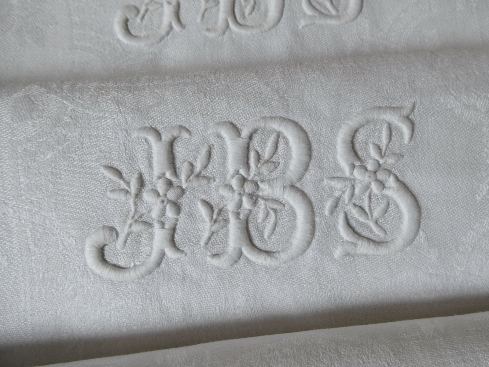 光の角度により浮かび上がるダマスク織りのエレガントな織り柄、中央には一針一針幾重にも針を運び手刺繍されたイニシャルが施されています。珍しい3文字イニシャルはぷっくりと厚みがあり大変美しい仕上がりです。