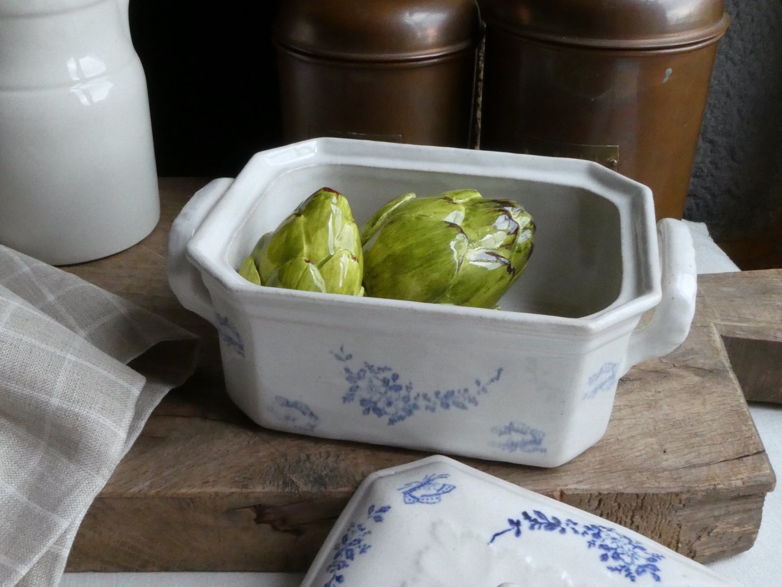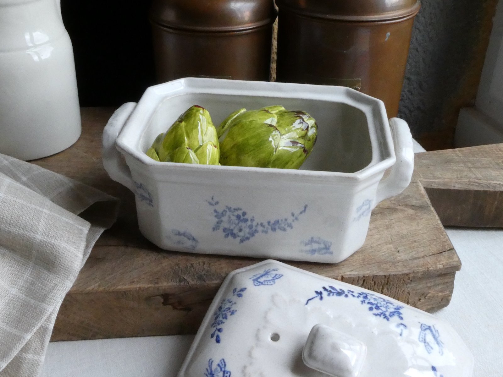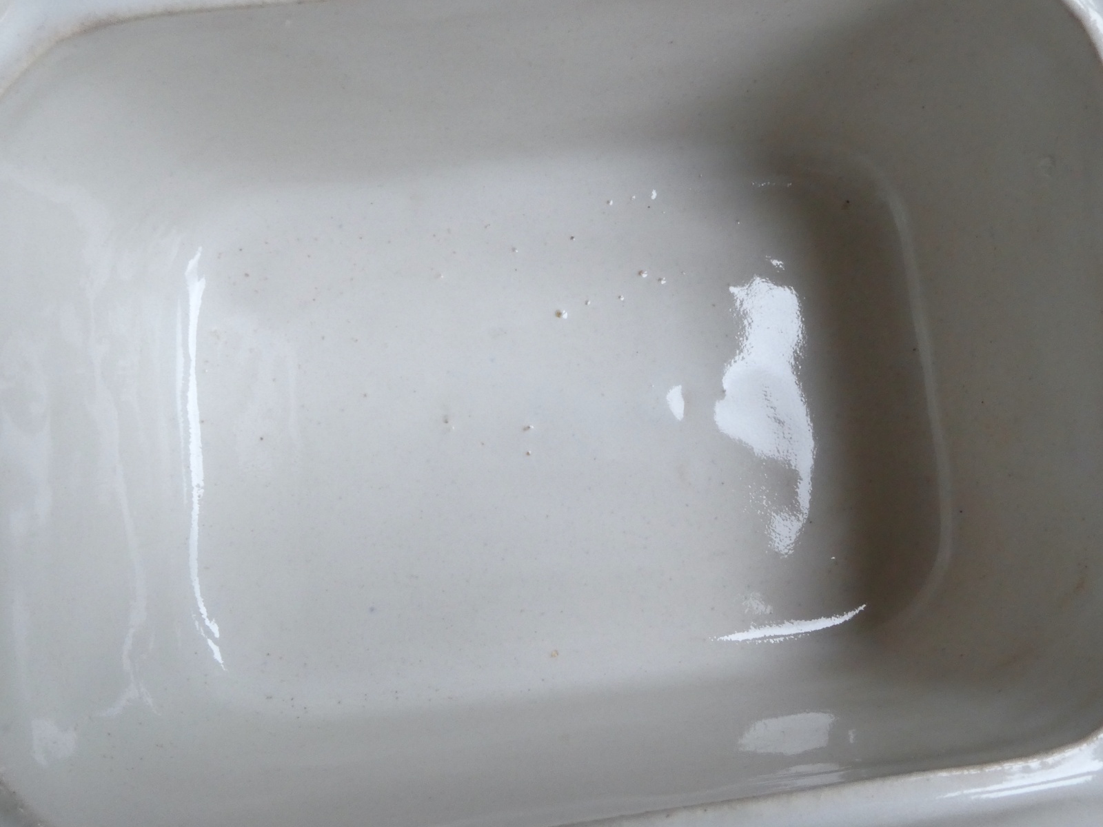 角を落としたレキュタングルのポットは白釉で包まれレリーフが少々見え隠れ、花と蝶々が綺麗なブルーで描かれています。ぽってり白釉やそこから覗く素地、素朴な絵付けが優しい趣だけれど、どこか洗練された印象も。深さしっかり、程よいサイズ、オーブン料理のほか、作り置きの保存容器としても...
