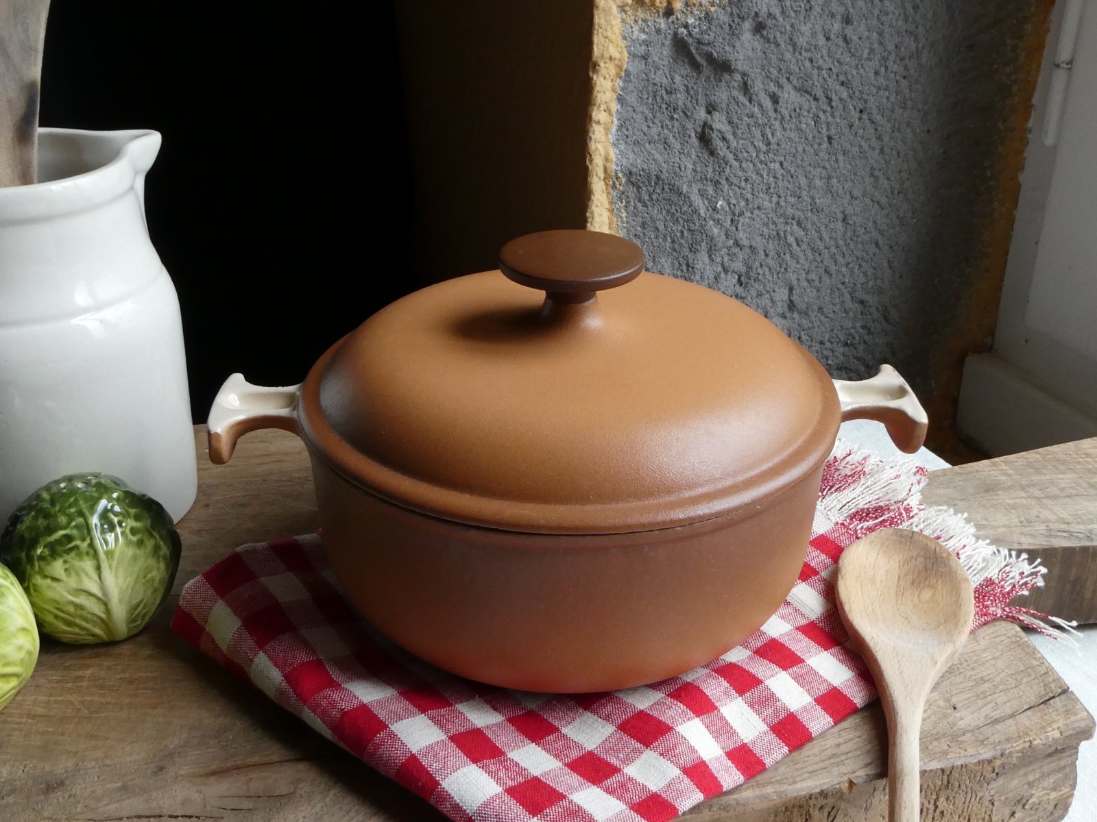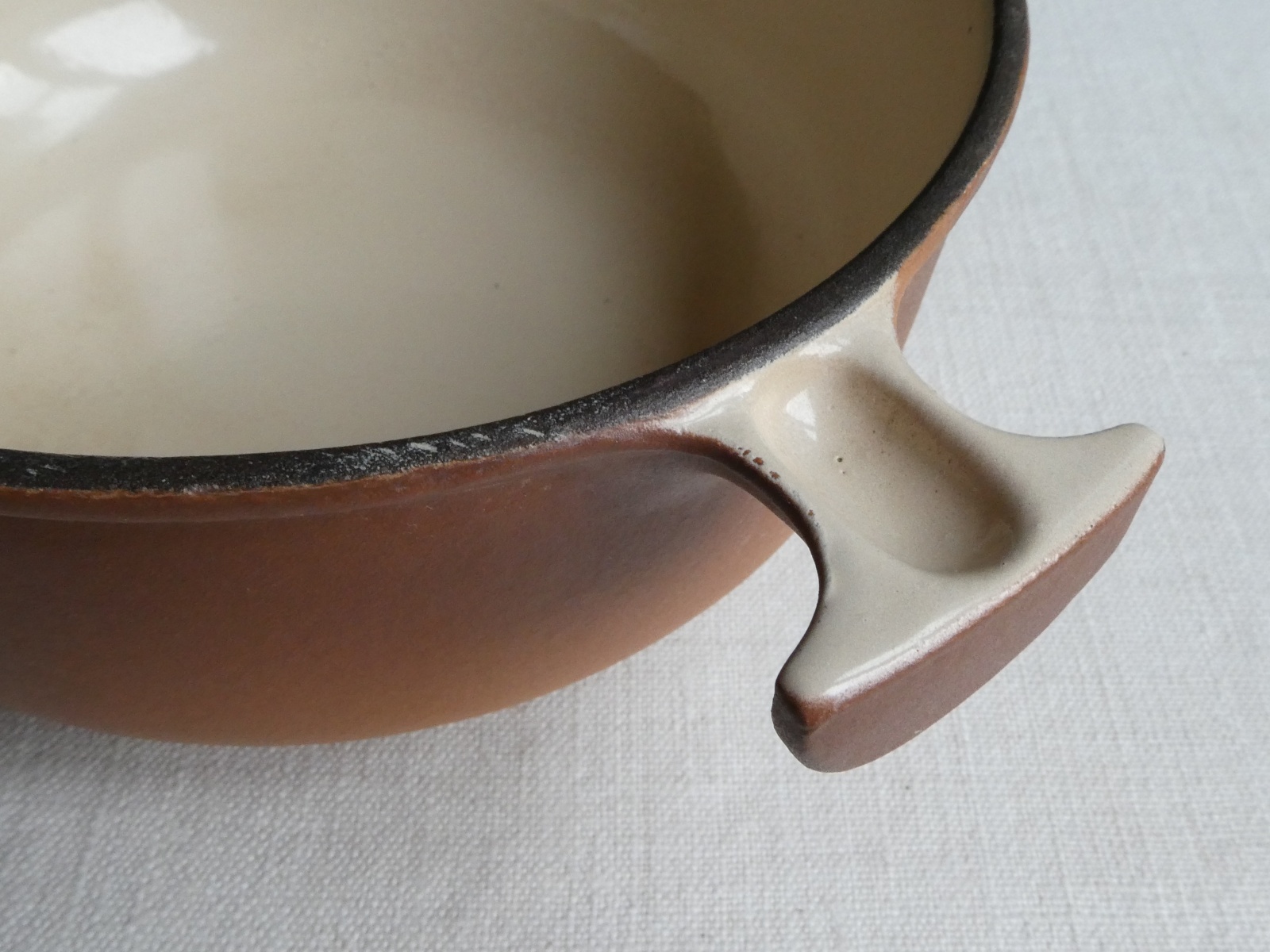 イタリア人デザイナー ENZO MARI(エンツォ マリ) 氏のデザインでコロンとしたフォルムがとってもキュートなお鍋、艶消しのマロン色はよく焼いたバゲットの色のよう、内側はクリーム色をしています。大きく作られた可愛らしい持ち手は手に馴染みがよく、用と美を兼ね備えています。