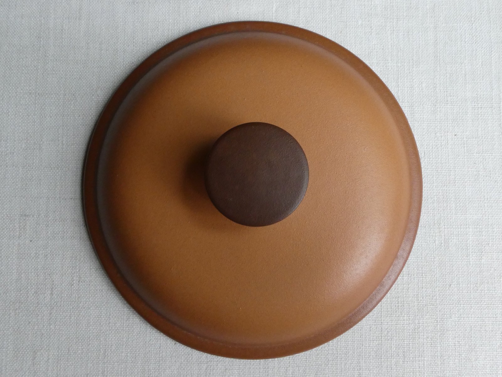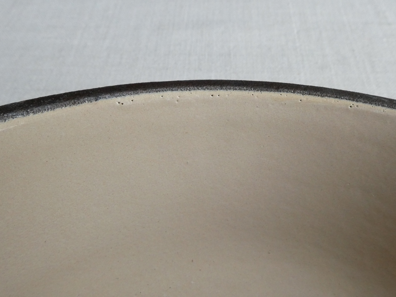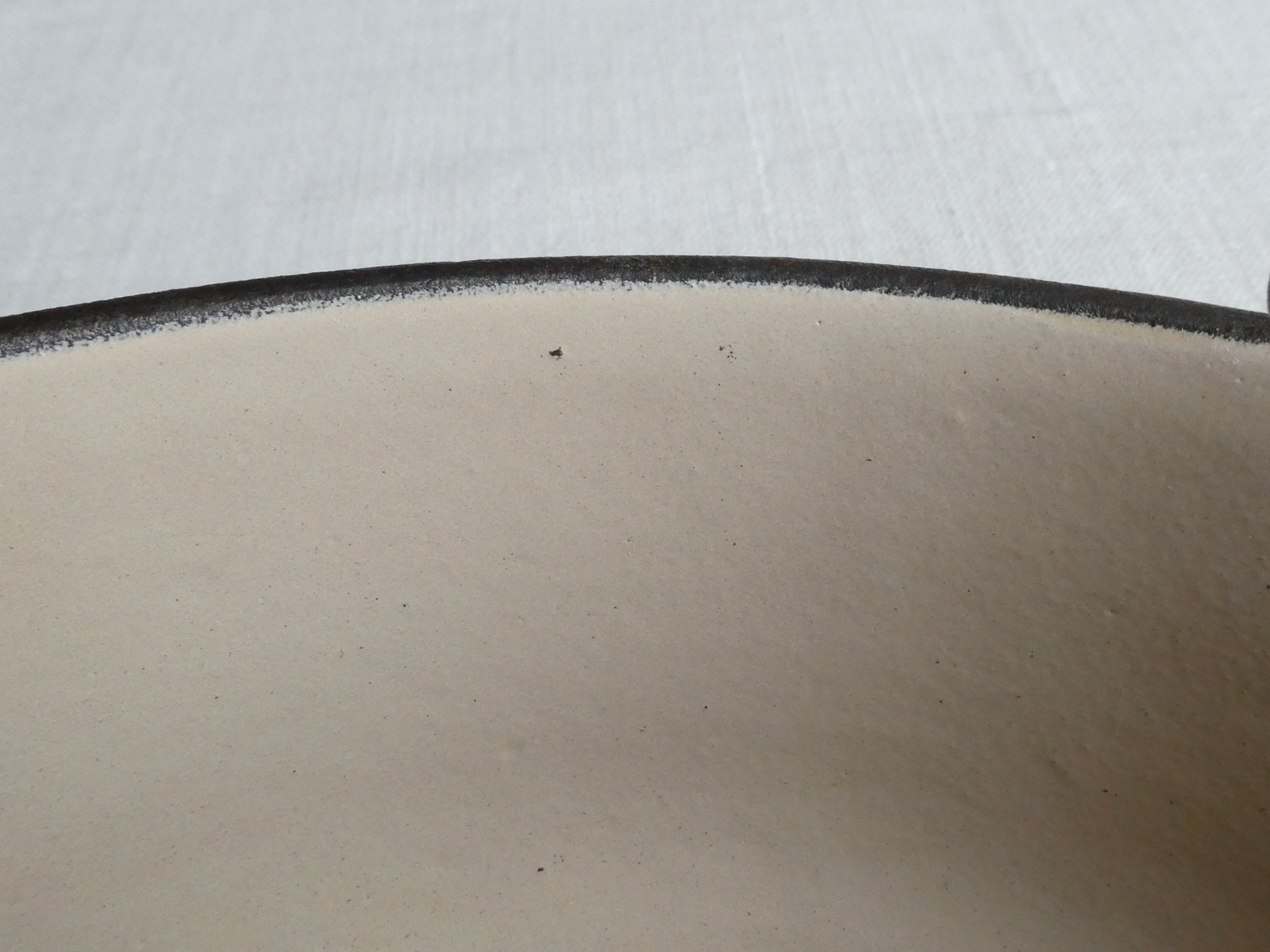 小さな点状の釉薬ムラ、極々稀に錆、鍋内底に極僅かな変色箇所、裏に焦げ跡、蓋の縁に削げがいくつかあります。全体として艶やかできれい、良い状態です。