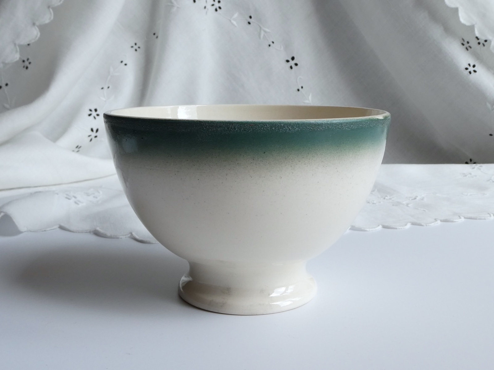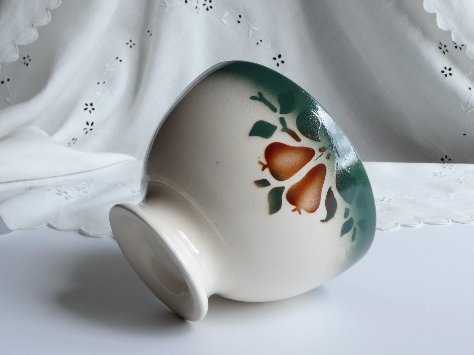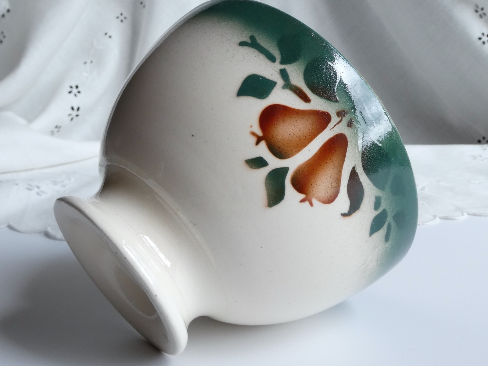 深さがあるコロンとした形状のボウルに綺麗なビリジアンのぼかし、洋梨のステンシルが何とも愛らしいフランスのエスプリが詰まった一点です。