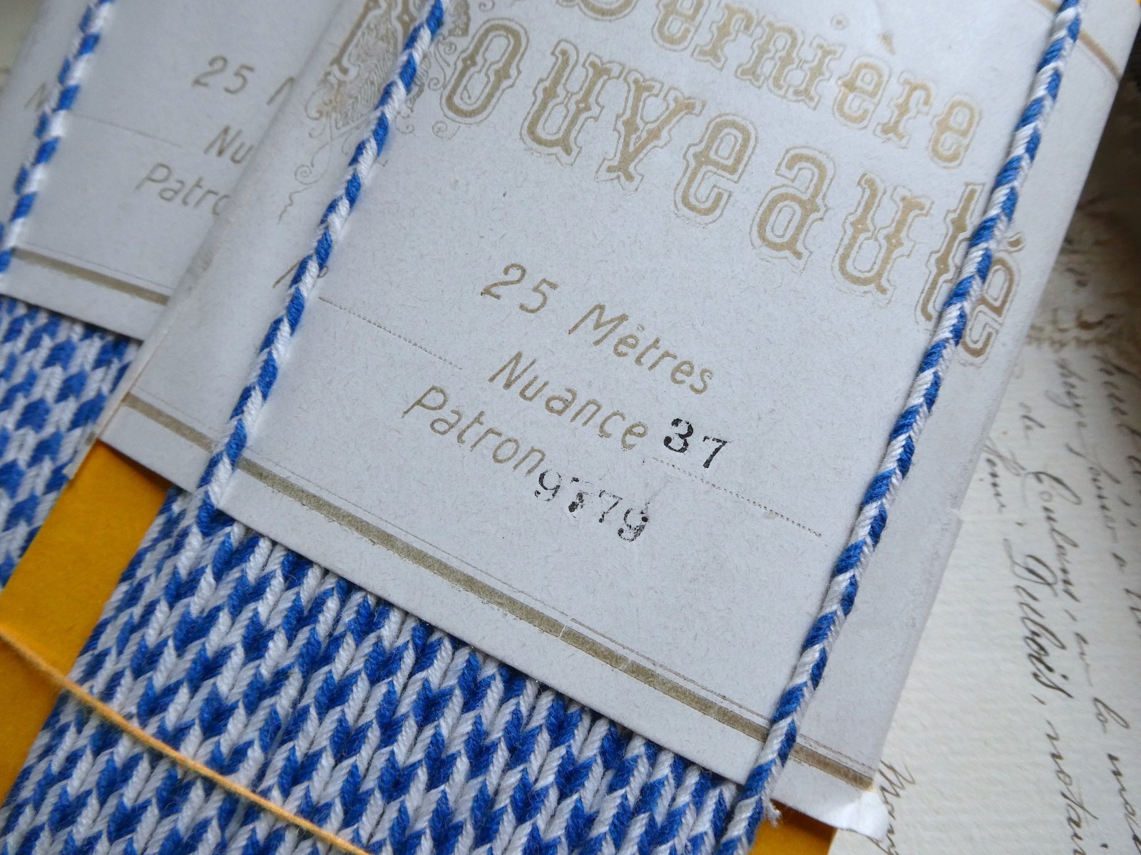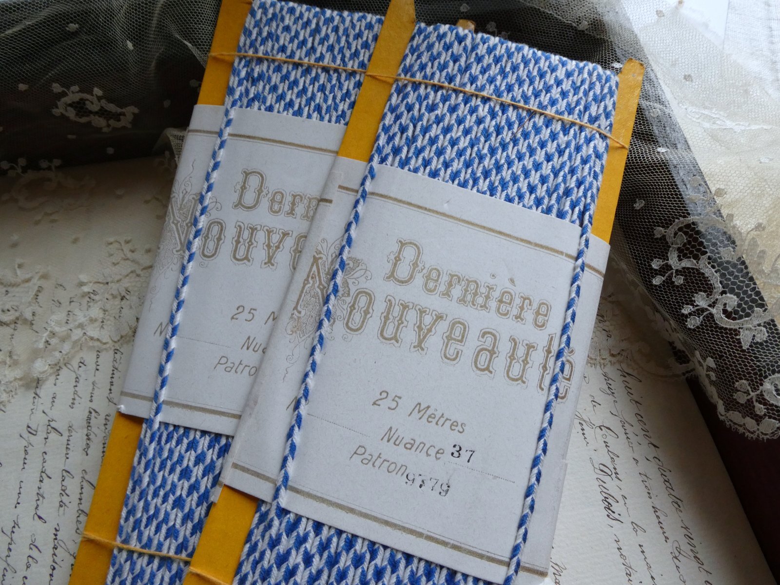 黄色の台紙に巻かれた青と白の編み込みコード、カルトナージュやファーニッシングでは可愛らしいアクセントになりそうです。アンティークメルスリーのコレクションとしてお裁縫箱にしのばせても!