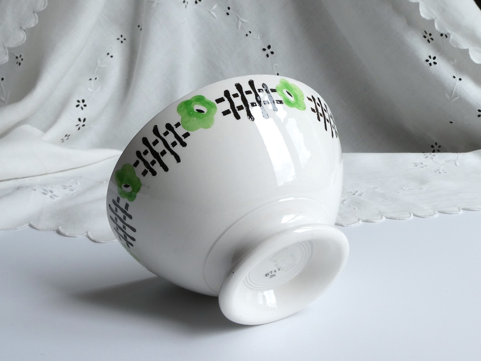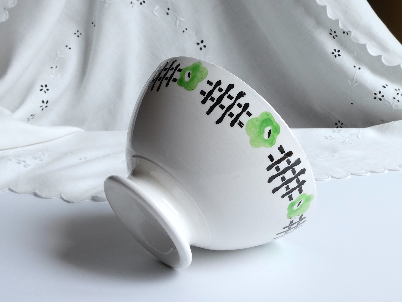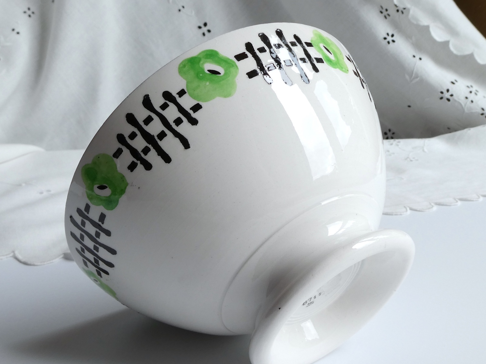 お花がぽんぽんとトレリスに咲いているような愛らしいハンドステンシルのボウル、ライムと黒の珍しい色遣いも目を惹きます。
