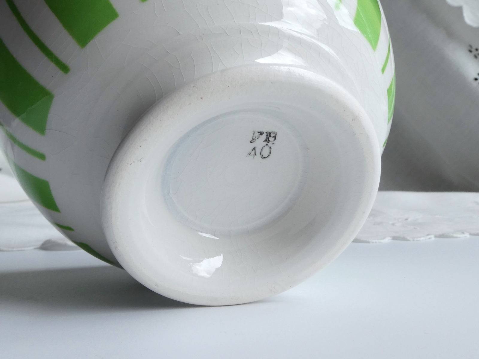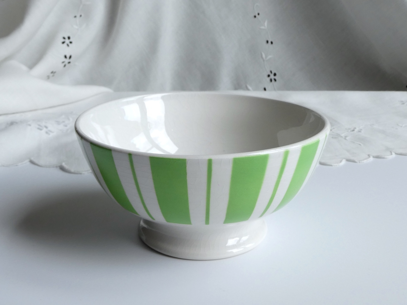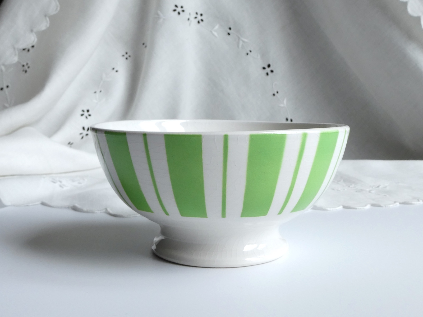 白をベースにライム色の太縞と細縞が交互にパターンを描く側面は何だかピアノの鍵盤みたい、コロンとした浅い形状も小粋です。可愛いフレンチキッチンに...