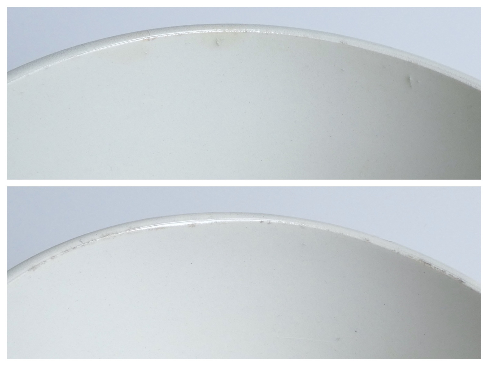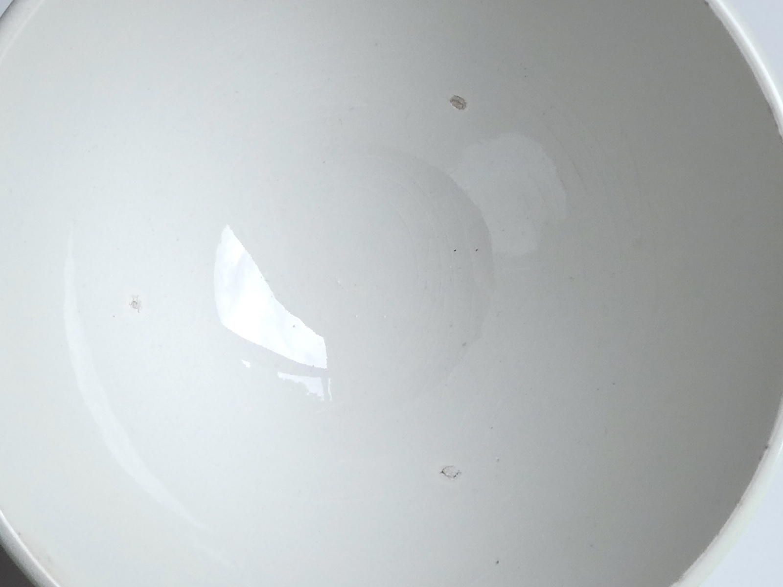 見込みに三脚跡、内縁にグレーの薄い色付き、外縁に小傷・ライン?貫入が1箇所、高台に釉付きある素地のへこみがあります。使用の形跡ほぼ無く艶やかできれい、良い状態です。