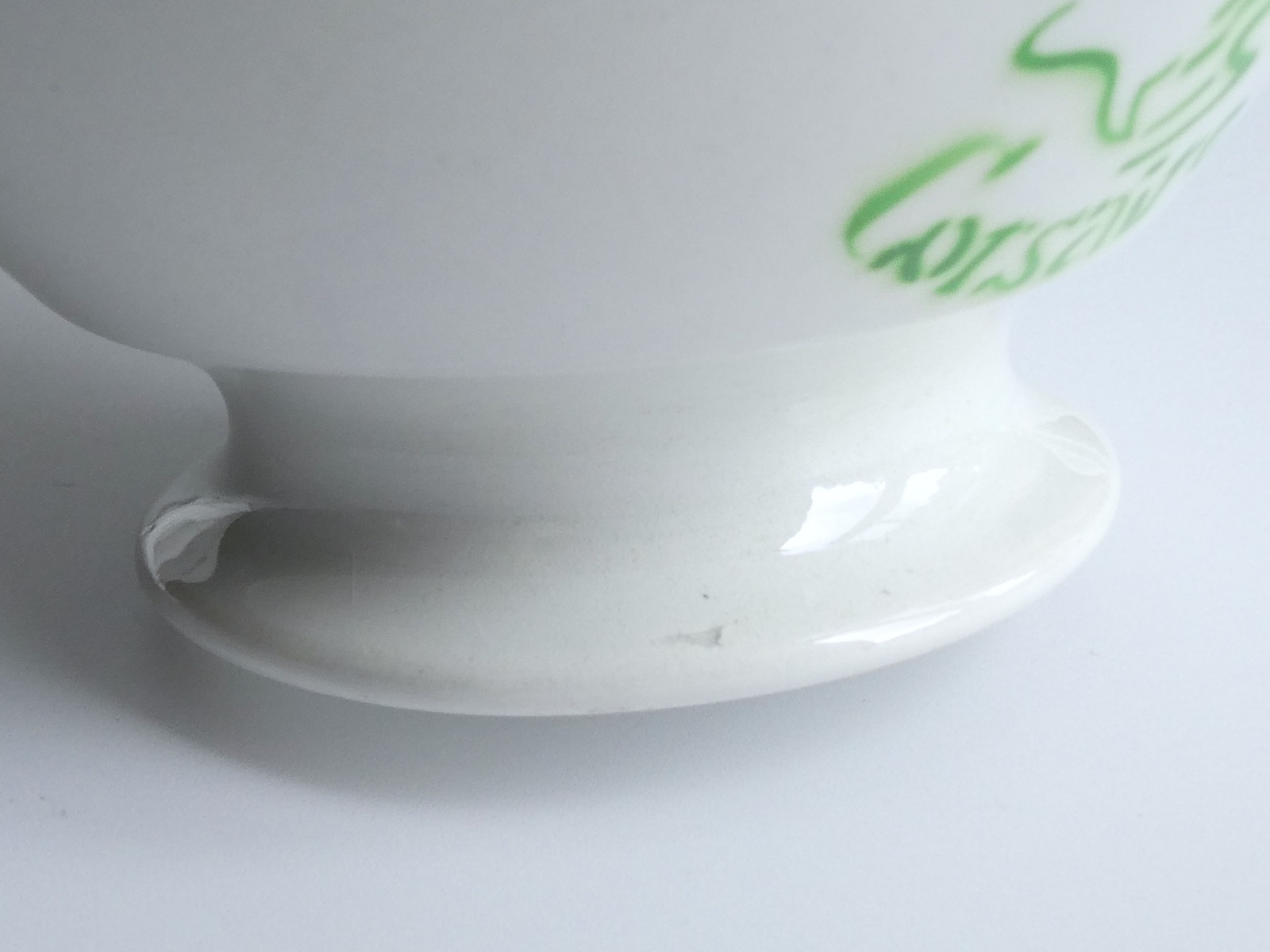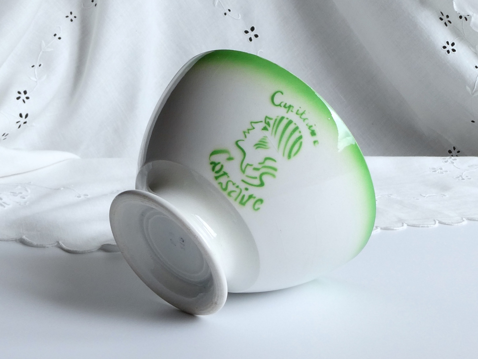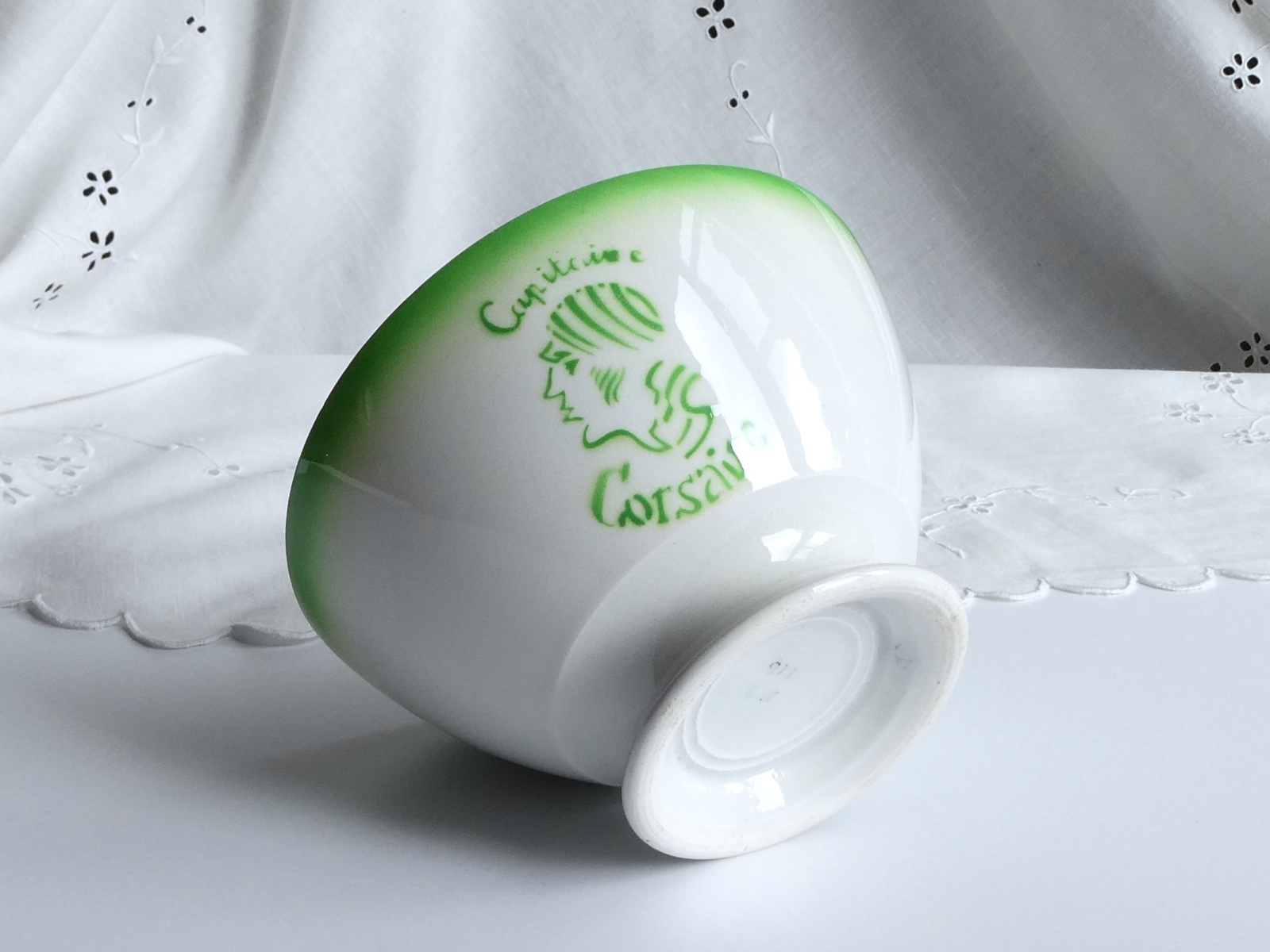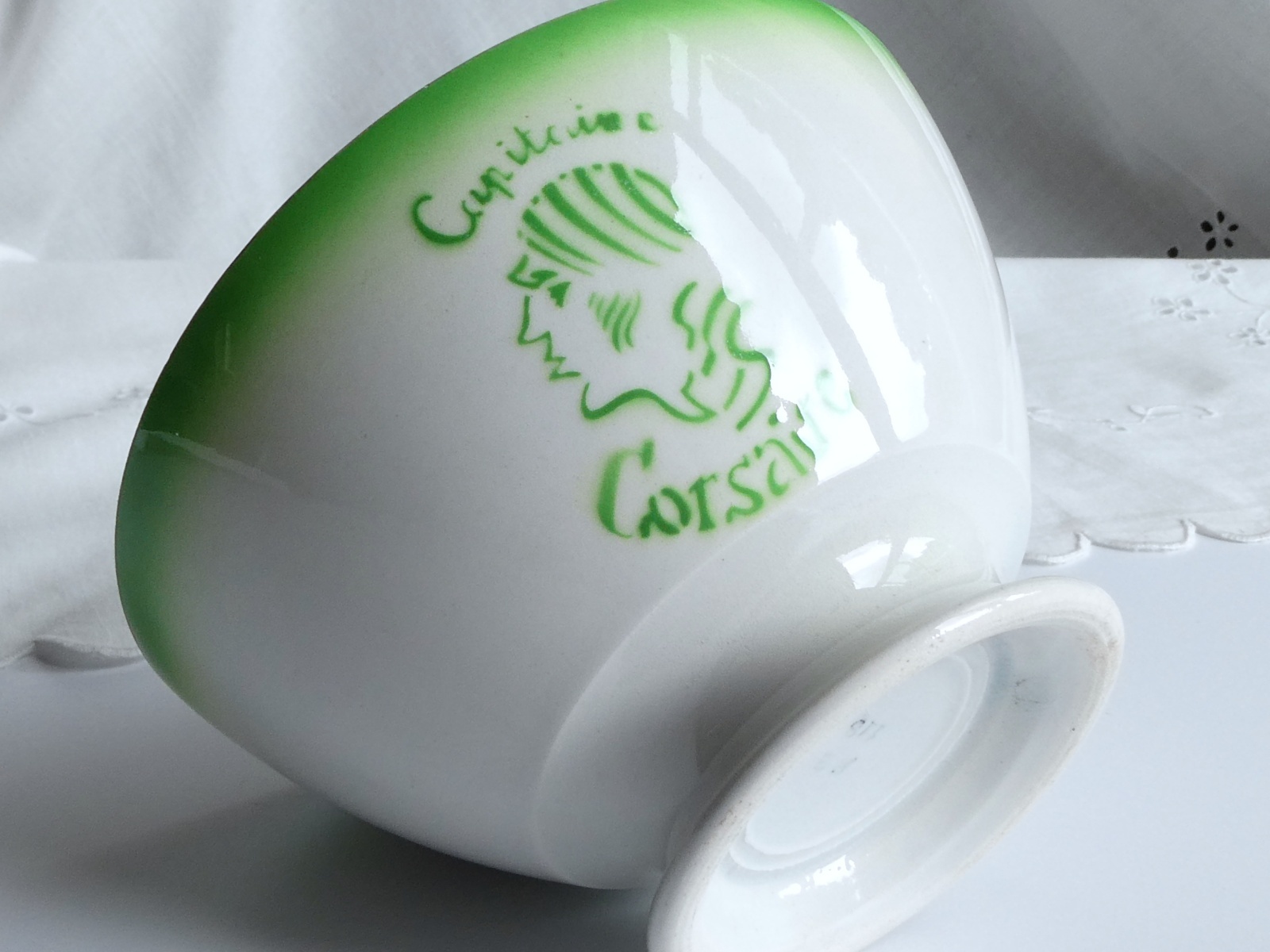 ライムグリーンのきれいなグラデーションとしましまスカーフを巻いた海賊隊長のイメージがステンシルされた文字入りボウルです。同名の服飾メーカーの販促品であったのかは定かではありません。
