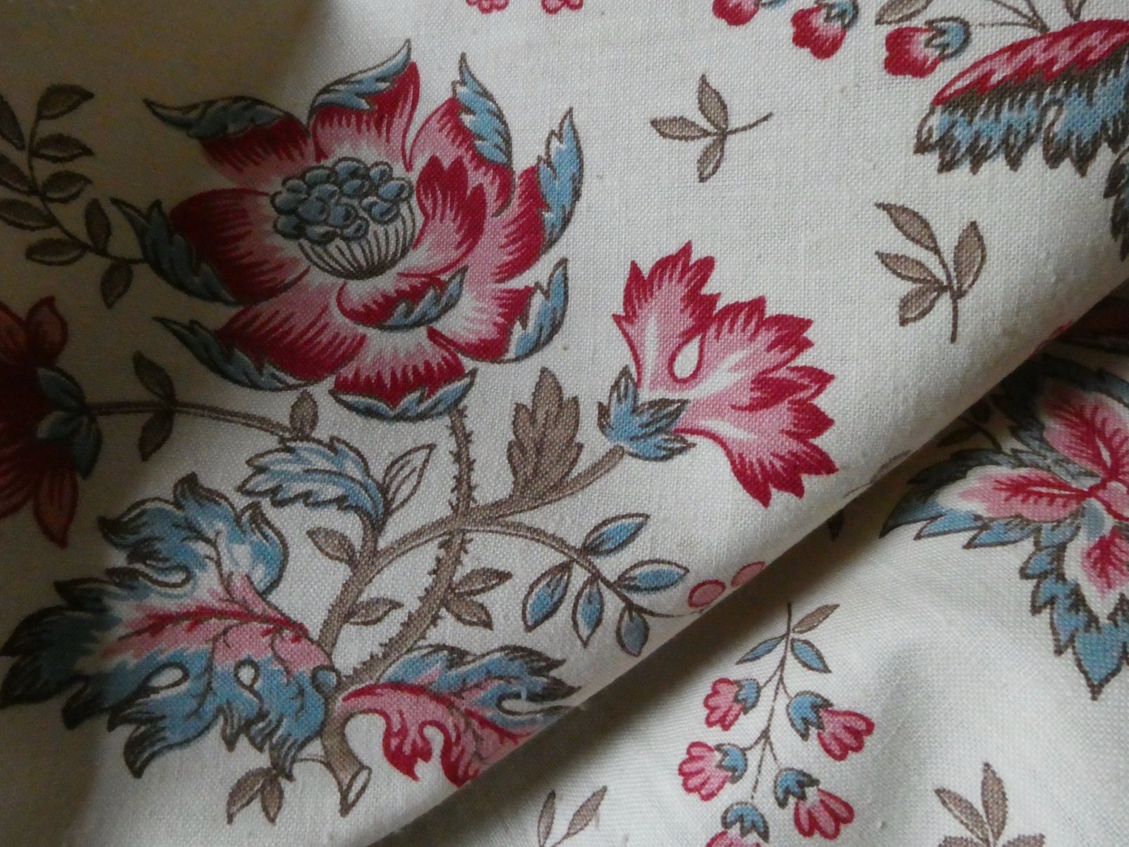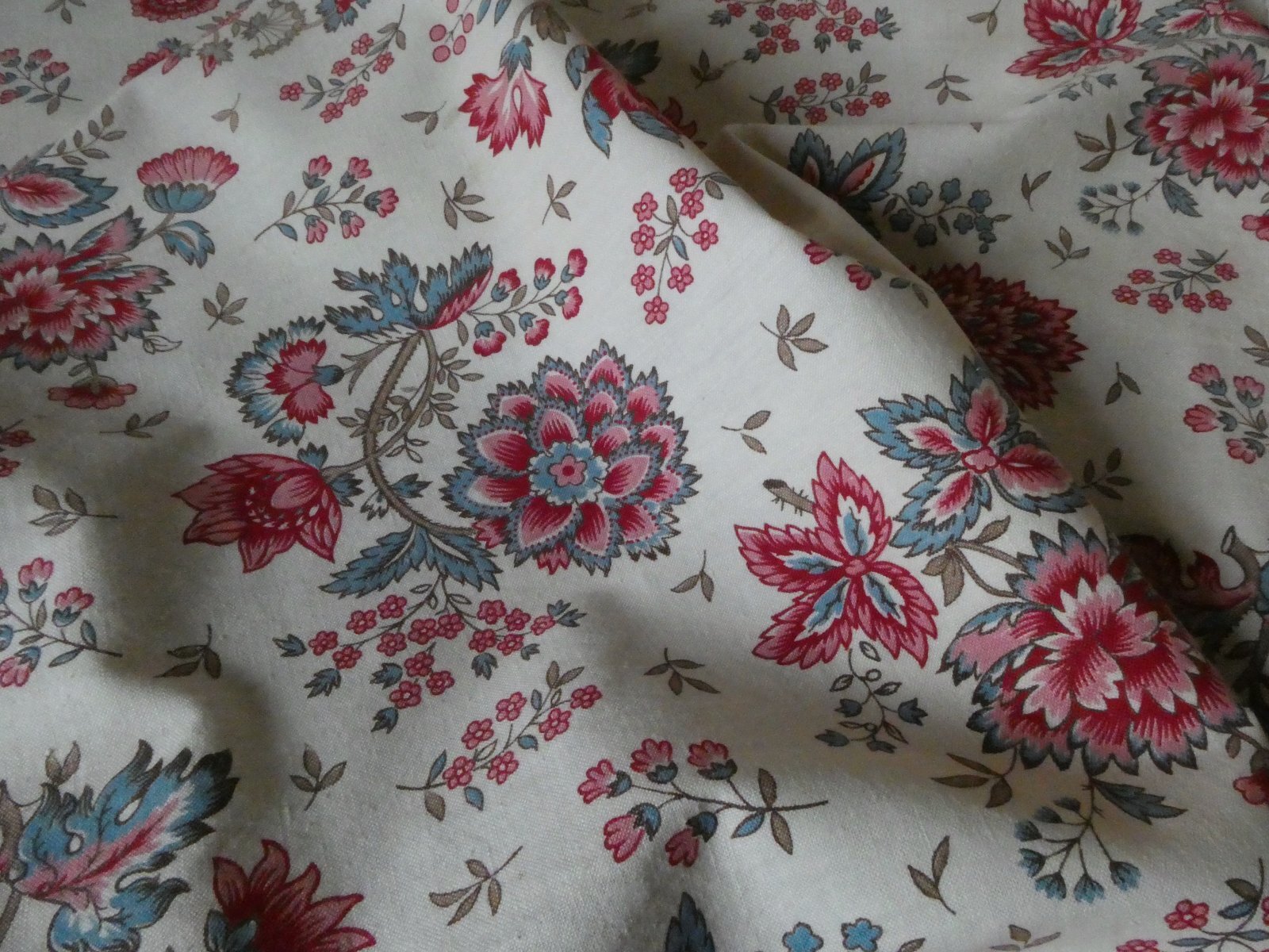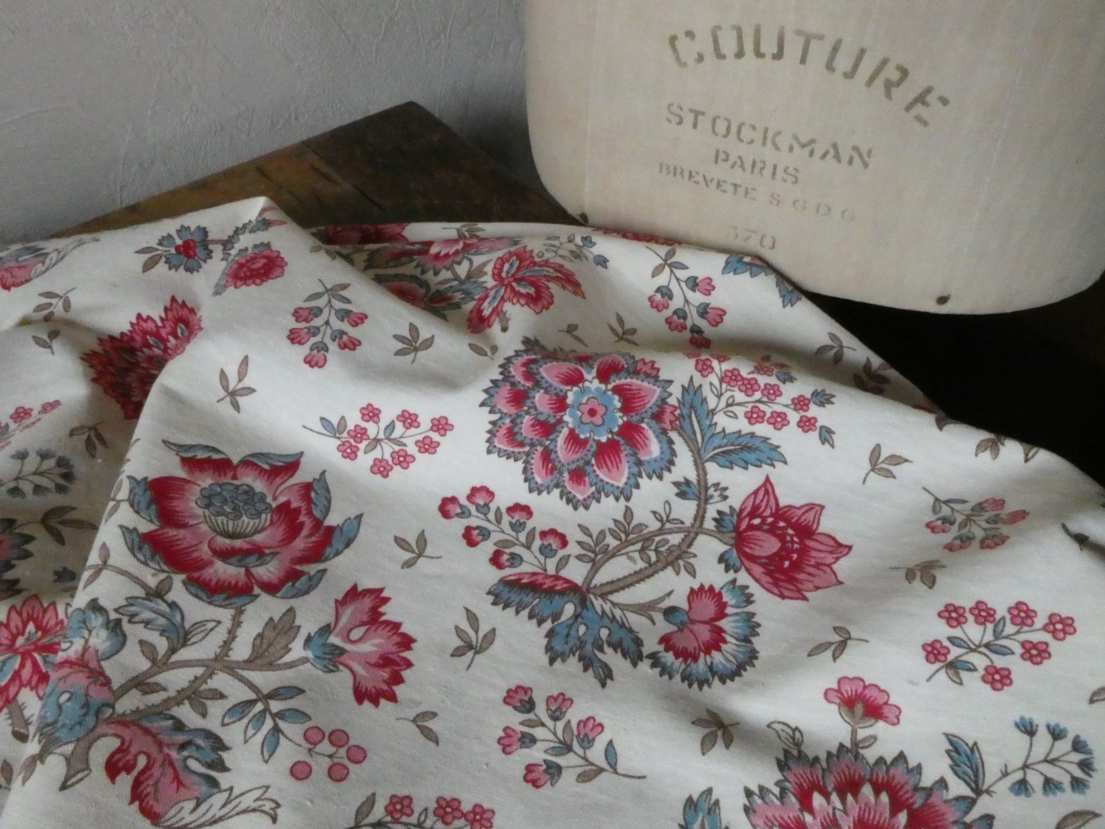 ややベージュを帯びたアイボリーにエキゾチックな花模様、紅や桃、群青などで彩色された花絵は格式高く、フレンチ更紗の美しさに魅せられます。中薄のしなやかなコットン生地です。