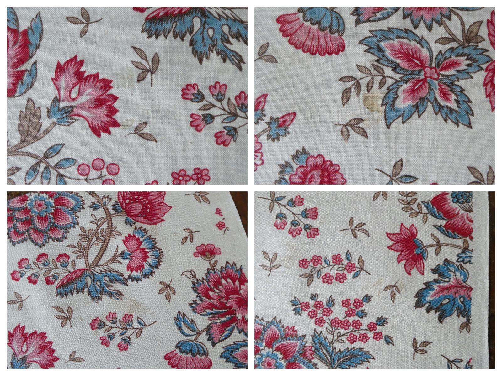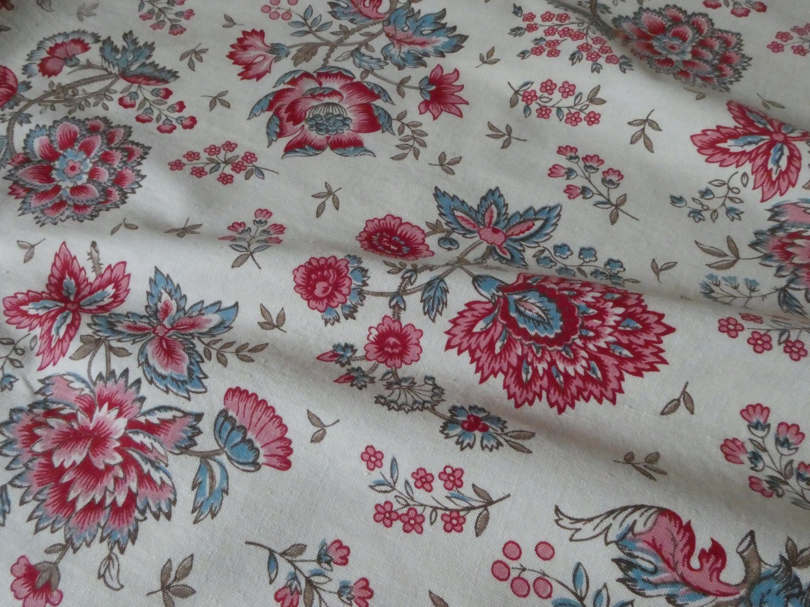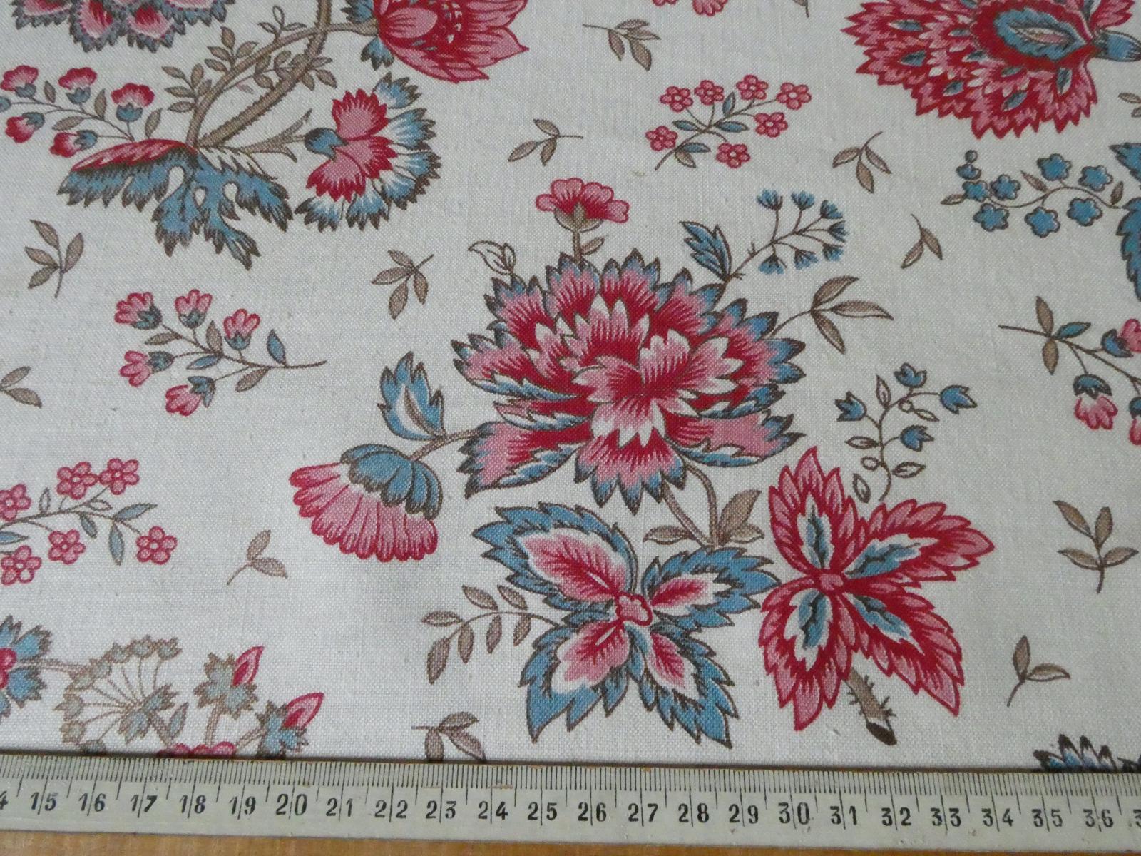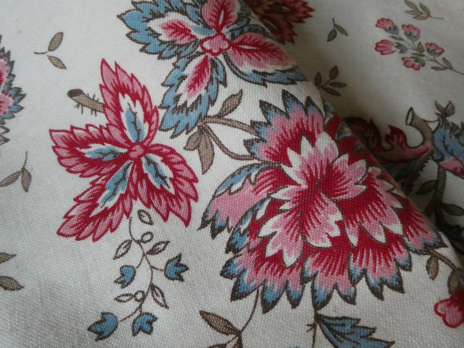 ややベージュを帯びたアイボリーにエキゾチックな花模様、紅や桃、群青などで彩色された花絵は格式高く、フレンチ更紗の美しさに魅せられます。中薄のしなやかなコットン生地です。