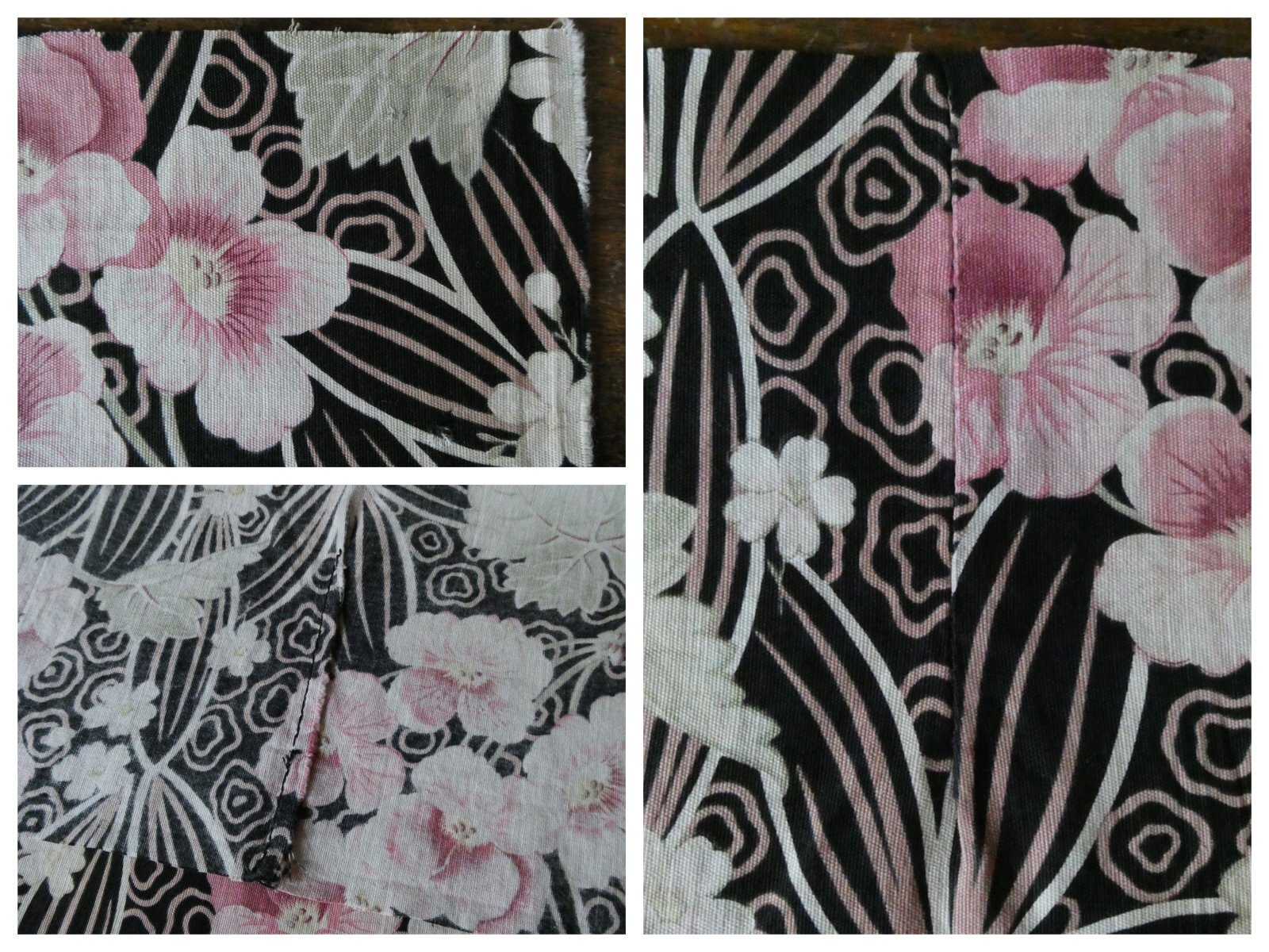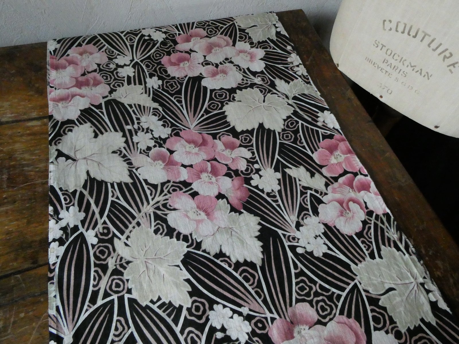 黒をベースにプリムラのような、サクラソウのような花が大きく描かれ、背景には葉と抽象的な模様、花びらと葉にのせられた淡いピンクとグリーンが極めて上品な、当時の貴族やブルジョワが好んだ大変美しい意匠の中薄コットン生地です。
